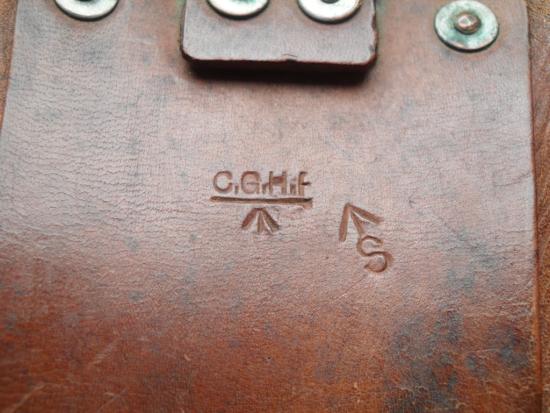 This pouch is an early 2nd type with the pillar stud at the top, there were six types produced throughout the duration of the Great War, the rear of the pouch bears the manufacturers mark C.G.H.F (Commonwealth Government Harness Factory) along with broad arrow acceptance marks.