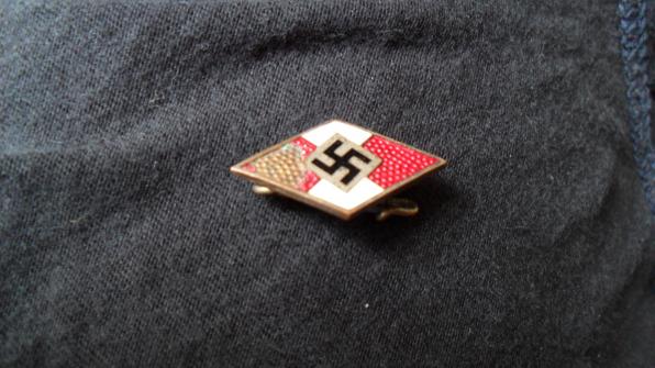Hitler Youth Members badge. Circled RZM with M1/15 (Hoffstater) makers code. Damaged area to the enamel.