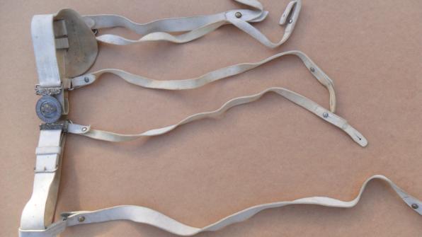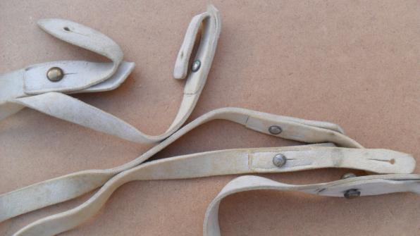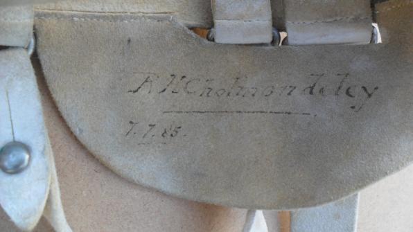 White buff leather belt with five hangers in good supple condition (light mottling in places) and named to Captain (later Major) Reginald. H. Cholmondeley, dated 7.7.85 (1885)