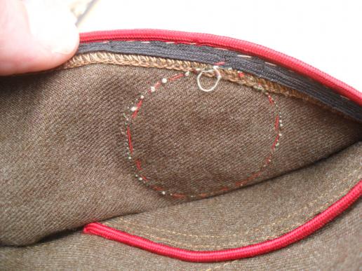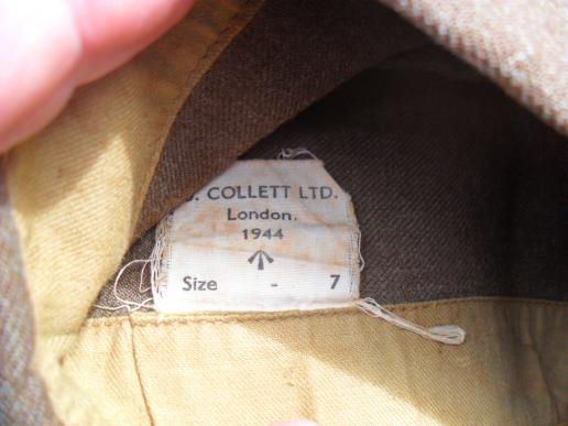 The cap was made by J. Collett Ltd, London in 1944 and in a size 7, the cap is piped in red for artillery designation.