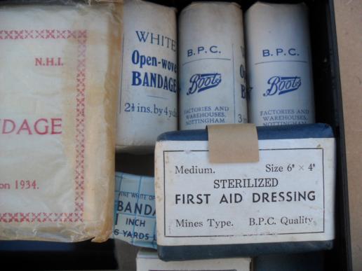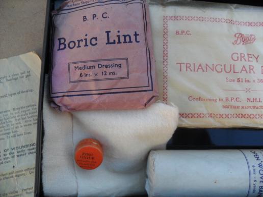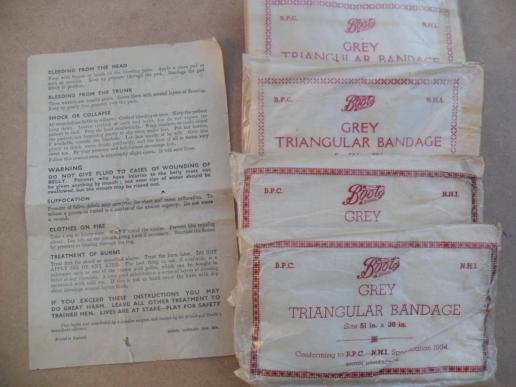 The contents consist of triangular & open wound bandages which are mainly Boots own brand along with other makes + an information sheet issued by the ministry of health for Scotland 6 /1940 on how to deal with injuries after an air attack.