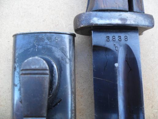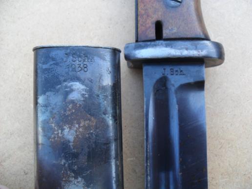 An early 84/98 bayonet with matching numbers (3838) made by Jetter & Scheerer who manufactured K98 bayonets between 1934 - 41.