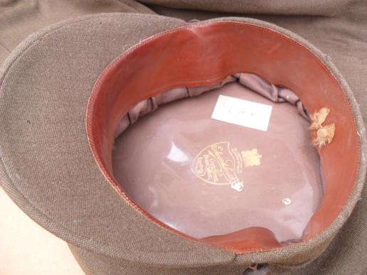 The cap is in very good condition apart from a moth hole on the crown and a nip on crown edge, lovely bronze cap badge and RWF side buttons, chin strap missing but easily replaced, there`s a piece of paper underneath the celluloid bearing Yates initials (floating around, not fixed).