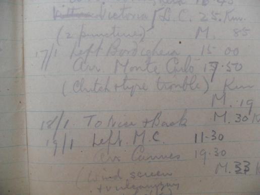 A 1917 dated 40 page booklet/notebook that became a personal diary after hostilities ceased, approximately 9 of the lined pages have post WW1 hand written entries detailing a road trip to the South of France recording arrival and departure times from various towns and cities, fuel stops and all expenditure for the journey, quite an interesting read and guessing from early 20's.