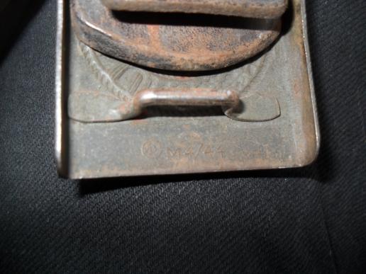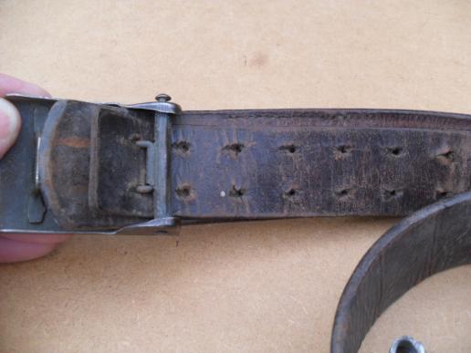 The buckle bears a RZM stamp along with the makers code M4 44 indicating the manufacturer as Paul Cramer & Cie, Ludenschied, the leather belt with its aluminium keeper is in good combat used condition with all stitching still intact.