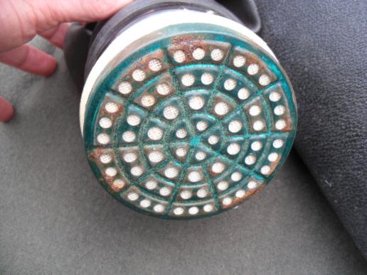 An excellent condition 1939 dated small size civilian respirator with a very pliable rubber face mask, the bottom of the filter with some very light rusting/staining but would improve with light cleaning.