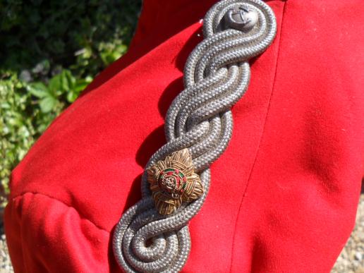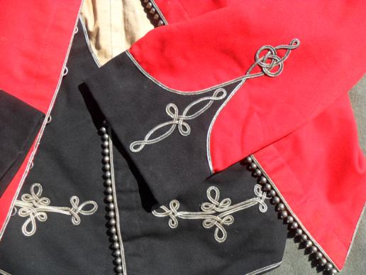 A fresh to the market and rather splendid looking Victorian officer`s scarlet melton mess jacket and silver corded waistcoat.