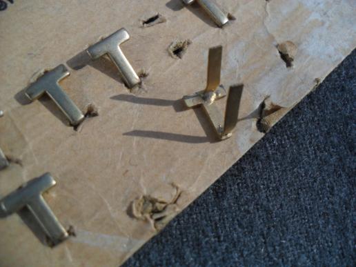 A pair of gilt washed brass Territorial letter T collar badges with prong backs, 10mm tall.