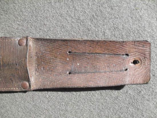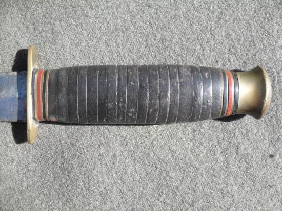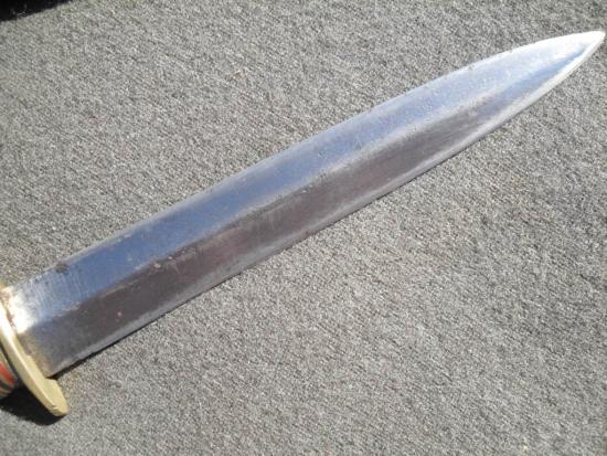 The grip is formed using pressed leather washers and held firm by the correct wartime brass pommel, the 6 3/4 inch double edged blade is in good used condition and does have some light age related blemishes plus evidence of sharpening, also bears the company logo of an eye, the original leather scabbard is missing its small retaining strap but the belt loops are fine, some period done repairs to side stitching.